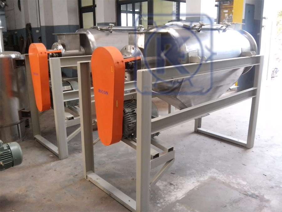 The material to be sifted is fed into the stationary cylindrical screen by means of a screw mounted on the rotating shaft. A series of paddles which rotate inside the screen without contact, centrifugally force the material against the screen breaking up soft agglomerates. Sub-sieve material (fines) that pass through the screen discharge into a collection hopper at the base of the machine. Oversize material and hard lumps (that cannot be broken by hand) traverse down the length of the screen to the overs outlet. An adjustable baffle plate at the end of the screen regulates the flow of overs.
